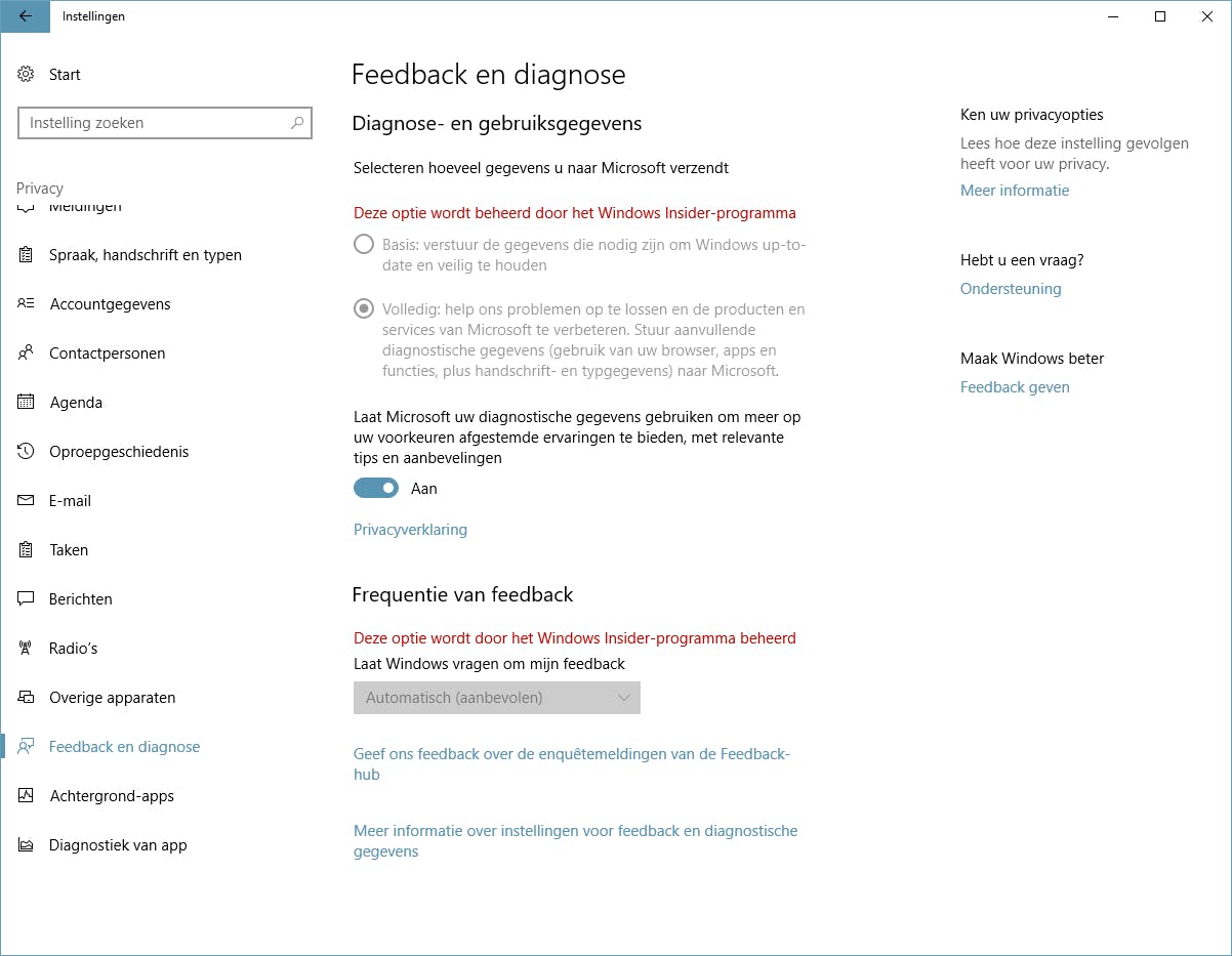 Een pijnpunt van Windows 10 is de privacy. Microsoft gebruikt het besturingssysteem om gegevens over de gebruiker te verzamelen en voor de Insider-builds geldt dat extra. Waar je in de gewone versie die spionage kunt uitzetten, geldt dat niet voor de Insider-builds. Open het onderdeel Privacy via Start / Instellingen. Een aantal opties is gelijk aan de normale Windows, maar alles onder Feedback en diagnose wordt (zo staat er letterlijk) “door het Windows Insider-programma beheerd”. Daar kun je niets aan veranderen. Volgens Microsoft zijn die gegevens essentieel om de kwaliteit van de nieuwe Windows te verbeteren, door problemen die optreden (zoals crashes en systeemfouten) op te sporen en op te lossen. Het is de prijs die je betaalt voor het mogen gebruiken van deze nieuwste builds.