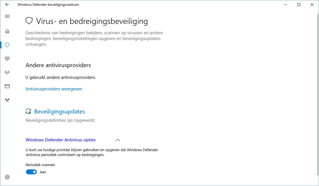 Nu toch het Beveiligingscentrum is geopend, kun je de beveiliging van de pc ook een kleine boost geven. Klik op Virus- en bedreigingsbeveiliging en Windows laat zien welke beveiliging actief is. Klik dan op het pijltje achter Windows Defender Antivirus-opties om de aanvullende opties te bekijken. Zet dan de optie U kunt uw huidige provider blijven gebruiken en opgeven dat Windows de antivirus periodiek controleert op bedreigingen op Aan. Met deze optie ingeschakeld blijft de eigen geïnstalleerde beveiliging gewoon de hoofdbeveiliging, maar zal af en toe ook de Windows Defender als extra beveiliging de computer scannen op malware.