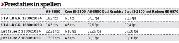 Een interessante mogelijkheid van het nieuwe AMD-platform is dat de ingebouwde gpu in de processor niet nutteloos wordt als u besluit om een losse grafische kaart te installeren. De kracht van ingebouwde gpu wordt gecombineerd met de kracht van de losse grafische kaart, waardoor u nog steeds iets hebt aan de gpu in de APU. U hebt hier wel een AMD Radeon DirectX 11 als grafische kaart voor nodig. AMD noemt de technologie AMD Radeon Dual Graphics en het is vergelijkbaar met AMD's CrossFire, waarbij twee normale grafische kaarten gecombineerd worden. De technologie is in potentie een relatief goedkope manier om uw grafische prestaties te boosten, al waarschuwt AMD wel dat u een snellere grafische kaart moet gebruiken dan de ingebouwde gpu in de APU om er echt iets van te merken. Wij hebben de technologie geprobeerd in combinatie met een AMD Radeon HD 6570. In de BIOS zult u moeten aangeven dat u gebruik wilt maken van Dual Graphics, waarna u in Windows kunt booten. AMD's Vision Engine zal de technologie nu activeren. We hebben twee spellen op verschillende resoluties gebruikt om te zien of we een verschil zien en hebben de AMD Radeon HD 6570 ook in de Intel-testmachine ingebouwd. In het spel Just Cause 2 hebben we alle grafische opties op de laagste instellingen gezet, antialiasing uitgeschakeld en de anisotropische filtering op 2x ingesteld. In S.T.A.L.K.E.R.: Call of Pripyat hebben we de grafische opties eveneens op het minimale ingesteld. Overigens zijn de spellen eigenlijk op geen één instelling speelbaar, maar u kunt wel goed het verschil in grafische kracht tussen AMD's en Intels ingebouwde grafische chips zien. Op AMD's oplossing zijn spellen met wat moeite wellicht nog speelbaar, terwijl u bij Intel echt niet aan spellen moet denken zonder extra grafische kaart. Na het toevoegen van de losse grafische kaart wordt de speelbaarheid op het AMD-platform een stuk beter. Er is zeker verschil te zien tussen de prestaties van de Intel-machine met de HD 6570 en de AMD machine met de HD 6570, waarbij de grafische kracht van de ingebouwde gpu toegevoegd wordt.