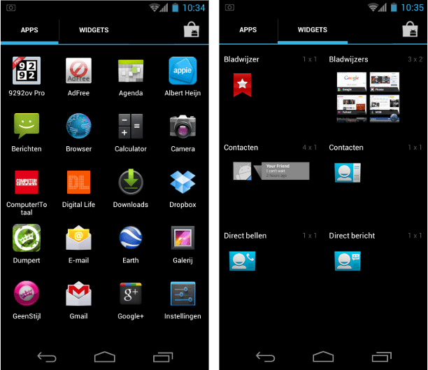 De app drawer overziet nu ook de beschikbare widgets.