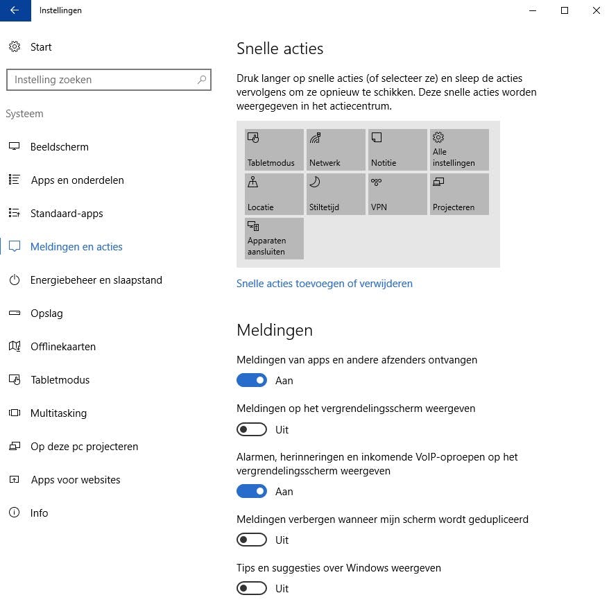 Ga naar Start > Instellingen > Systeem en klik in het linkerpaneel op Meldingen en acties. Scrol in het rechterpaneel omlaag naar de headerMeldingen van deze apps weergeven en zet de schakelaars bij de apps waarvan je geen meldingen meer wilt ontvangen op Uit. Als er apps zijn waarvan je wel notificaties wilt krijgen, moet je de schakelaar bij deze apps op Aan zetten.