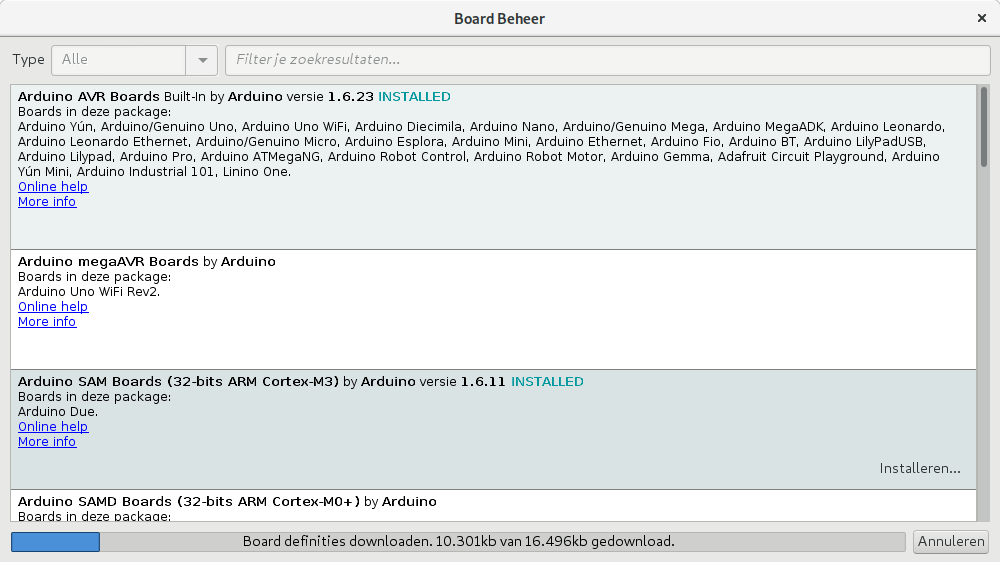 Die ondersteuning voor (een familie van) bordjes zit in een afzonderlijk pakket, een Arduino-kern (‘core’). De beschikbare kernen krijg je te zien in het bordbeheer van Arduino IDE, dat je opent in het menu Hulpmiddelen / Board / Board Beheer (sic). Je ziet daar dat de eerste kern geïnstalleerd is, Arduino AVR Boards, en in de omschrijving krijg je een uitgebreide lijst van alle ondersteunde bordjes.