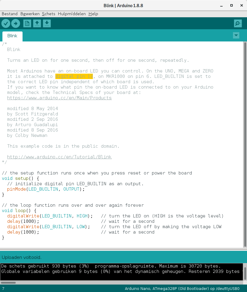 Arduino IDE compileert nu je schets naar machinecode voor de microcontroller en uploadt je code naar het bordje. De voortgang krijg je in het zwarte tekstveld onderaan te zien. Als alles goed gaat (en je dus geen foutmeldingen in rode letters te zien krijgt in het tekstveld onderaan), begint de ingebouwde led van je Arduino te knipperen. Dat werkt ook als je naderhand je Arduino rechtstreeks van een voedingsadapter van stroom voorziet: de code blijft opgeslagen tot je die met een nieuwe schets overschrijft.
