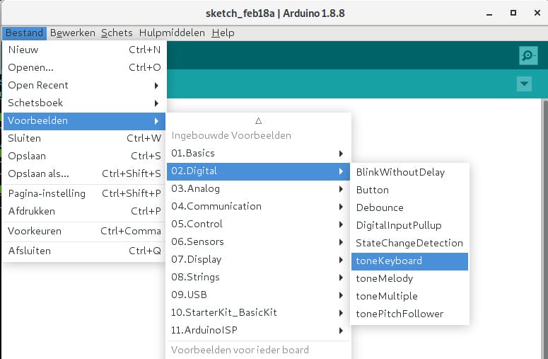 De Arduino IDE komt standaard al met talloze voorbeeldschetsen. Klik in het menu Bestand op Voorbeelden en kies dan in de categorie 01.Basics voor Blink. De code begint met een groot blok tekst tussen regels die beginnen met /* respectievelijk */. Daarmee geef je aan dat de tekst hiertussen commentaar is: de Arduino IDE negeert dit, zodat je hier zelf uitleg voor anderen kunt typen. De makers van de voorbeeldschets leggen hier uit wat de schets doet en verwijzen naar een webpagina met meer informatie. Het is aan te raden om je eigen Arduino-schetsen ook te beginnen met zo’n blok commentaar.
