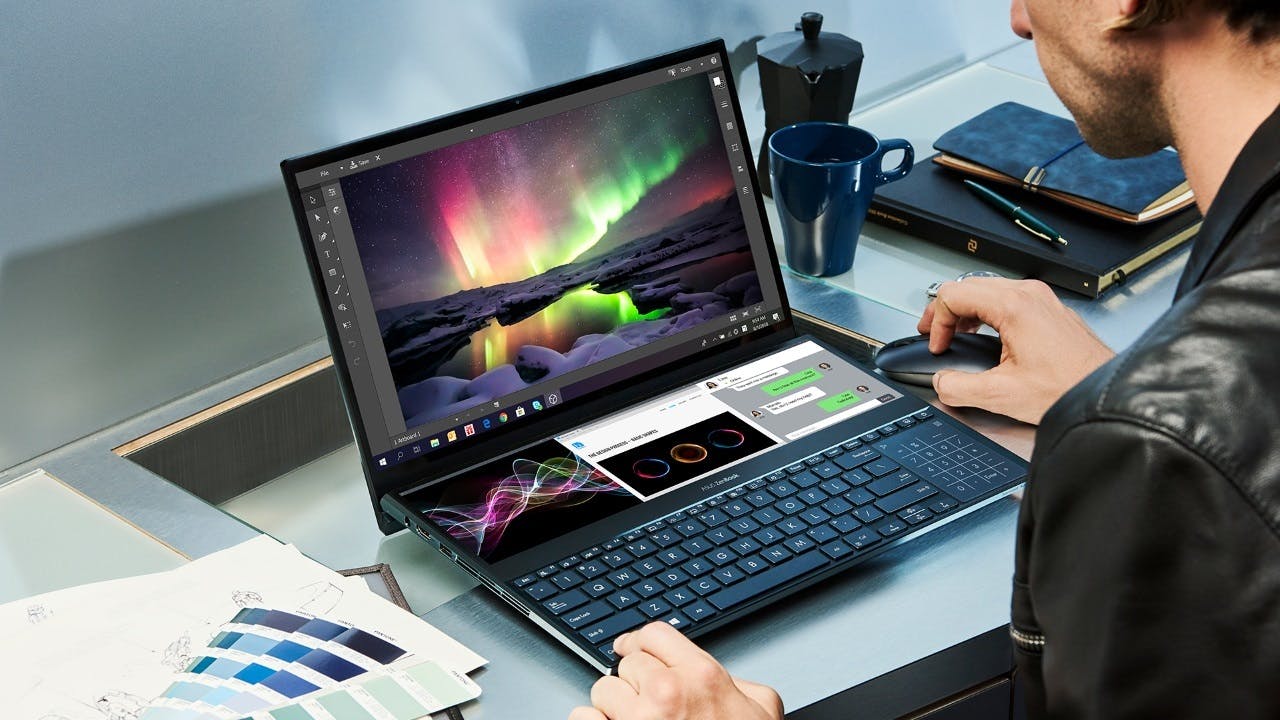 In het verlengde daarvan presenteerde Asus tijdens Computex 2019 ook de Asus Zenbook Pro Duo. In plaats van een tweede schermpje in het touchpad, heeft deze laptop een groot tweede scherm boven het toetsenbord. Dit scherm kan als een tweede scherm gebruikt worden: handig voor kleine Windowsvensters, zoals de verkenner, een browservenster met een YouTube-tutorial of elementen die je gebruikt bij foto-, video- of audiobewerking. Maar het scherm kan ook gebruikt worden als verlenging van het hoofdscherm, wat bijvoorbeeld weer handig is voor webdevelopers, die zoveel mogelijk regels code op het scherm willen tonen. Het moge duidelijk zijn: met de Zenbook Pro Duo probeert Asus vooral mensen aan te spreken die hun laptop voor werk of studie gebruiken.