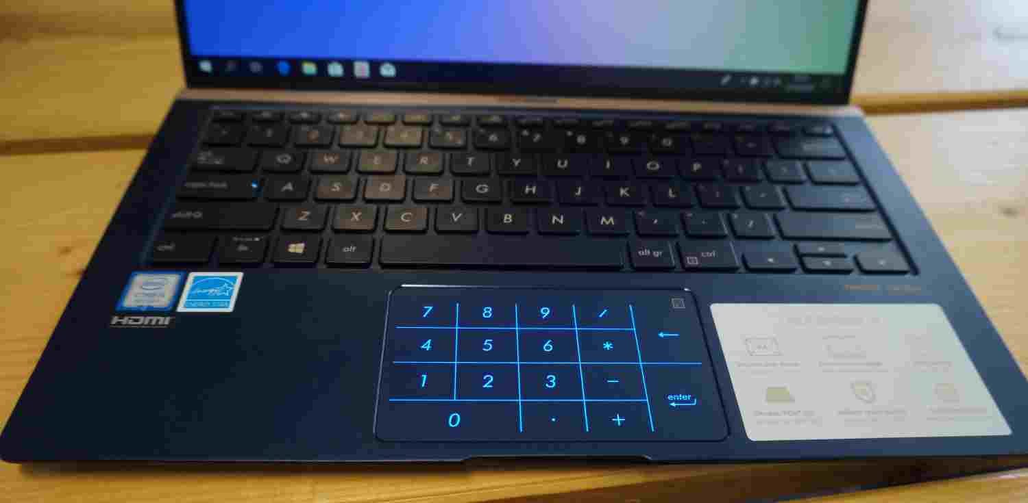 De touchpad is een precisie-touchpad dat ondersteuning biedt voor gebaren tot en met vier vingers. Rechtsboven op de touchpad is een rekenmachinepictogram gedrukt. Wanneer je hierop drukt, tovert de ZenBook 14 een leuke truc uit de hoge hoed. De touchpad wordt verlicht met numerieke toetsen en functioneert als numeriek toetsenbord. Handig is dat je tegelijkertijd de muiscursor ook kunt bedienen. Het NumberPad is wellicht handig voor wie veel in Excel werkt, al zal het lastig zijn om cijfers blind in te voeren. Al met al een leuke gimmick die niet in de weg zit