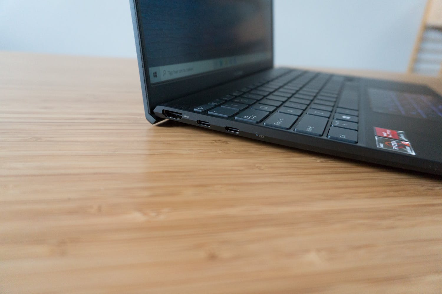Je krijgt met deze laptop een bruikbare selectie aansluitingen. In tegenstelling tot de Intel-tegenhanger ontbreekt Thunderbolt 3, maar heel erg is dat niet. De twee usb-c-poorten behouden de beste eigenschappen van Thunderbolt 3: laden, video-uitvoer en de snellere usb 3.2 gen2-snelheid. Voor vrijwel iedereen zijn deze usb-c-poorten dan ook gelijkwaardig aan de Thunderbolt3-poorten op de UX425. Specifieke Tunderbolt-apparatuur is prijzig, terwijl je dankzij de Gen2-snelheid wel snelel externe ssd's kun gebruiken. Iets wat niet kan op deze laptop is Thunderbolt-apparatuur gebruiken, zoals een externe grafische kaart.