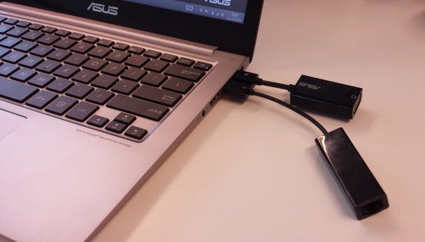 ASUS heeft de Zenbook voorzien van een heel bruikbare selectie uitbreidingspoorten. We zien driemaal usb 3.0, HDMI, Mini DisplayPort, een 3,5mm-hoofdtelefoonaansluiting en een SDHC-kaartlezer. Daarnaast levert ASUS twee adapters mee. De eerste is een adapter van Mini DisplayPort naar VGA en de tweede is een usb-netwerkadapter. Helaas is de netwerkadapter wel een usb2.0-exemplaar dat beperkt is tot een netwerksnelheid van 100 Mbit/s. Jammer, want er bestaan usb3.0-exemplaren met een volledige gigabitsnelheid. Het wifi-kaartje is afkomstig van Intel en ondersteunt 802.11ac met een maximale snelheid van 867 Mbit/s. Naast wifi ondersteunt het Intel-kaartje ook bluetooth 4.0.