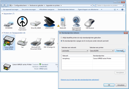 We beginnen bij u thuis. Open Apparaten en printers via uw startmenu. Selecteer een willekeurige printer door hierop te klikken en kies in het menu voor Standaardprinters beheren. Activeer de instelling De standaardprinter wijzigen als ik me bij een ander netwerk aanmeld. Kies in het drop-downmenu de naam van uw thuisnetwerk. Geef in het drop-downmenu Selecteer een printer aan welke printer u thuis wilt gebruiken en bevestig met Toevoegen. Herhaal ditzelfde voor uw kantoornetwerk en sluit af met OK.
