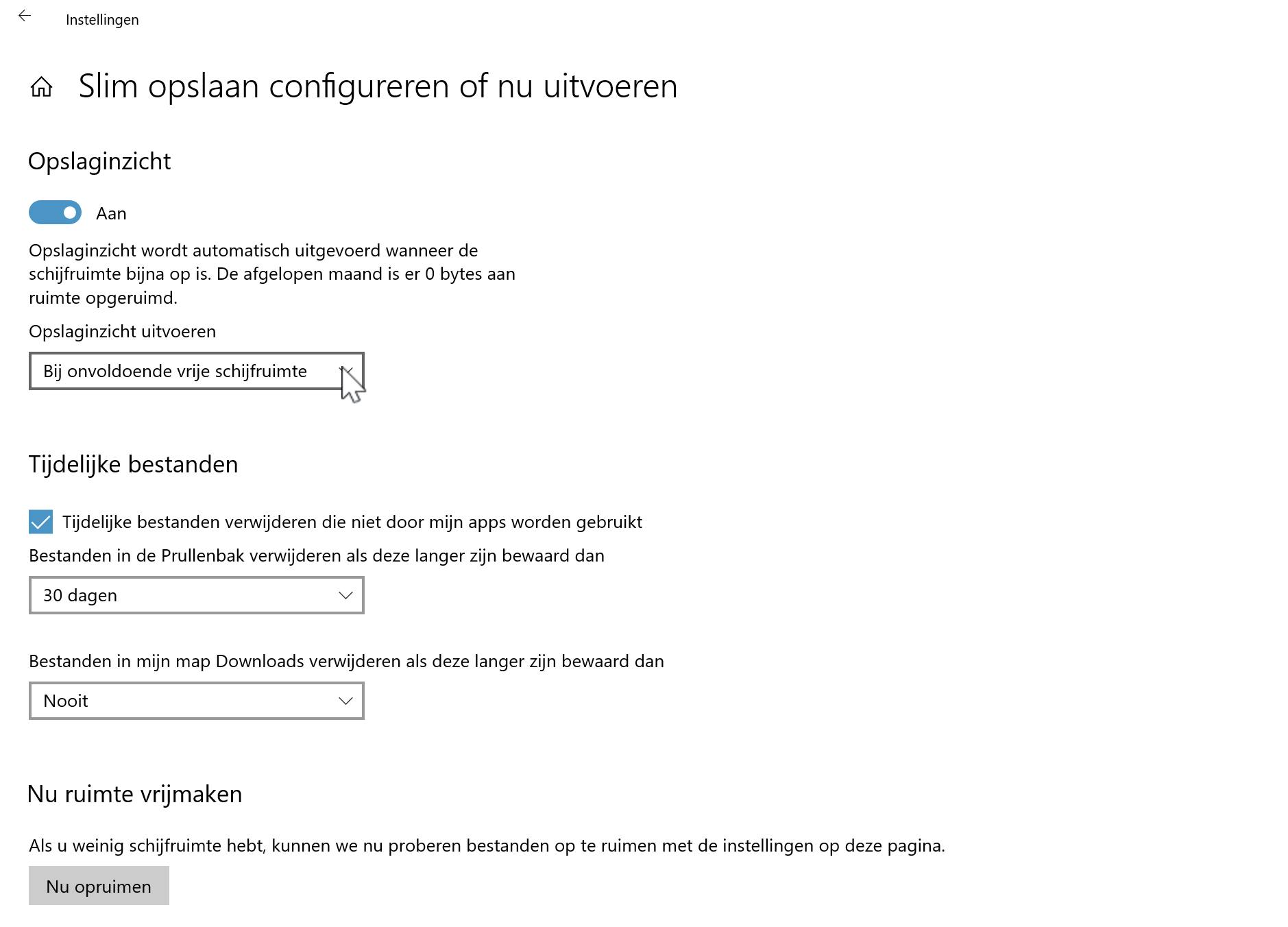 Zet de schakelaar onder Opslaginzicht aan. De standaardinstelling bij onvoldoende vrije schijfruimte voldoet in principe, maar je kunt problemen ook (veel) eerder voorkomen door een tijdsinterval voor de automatische opruiming in te stellen. Heb je direct schijfruimte nodig, klik dan op de knop Nu opruimen en wacht even. Die minuten zijn Microsoft-minuten, dus het is afwachten hoe lang de nu gestarte actie echt gaat duren. Zet je de optie Tijdelijke bestanden aan, dan worden ook – inderdaad – de tijdelijke bestanden meegenomen. Én – desgewenst – bestanden in de map Downloads. Dat laatste kan handig zijn als je een vergeetachtig type bent, maar ook voor tranen zorgen als je een grote en belangrijke download kwijtraakt.