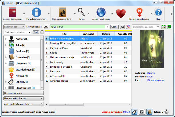 Zeker in grote boekencollecties is het lastig om de juiste titel eruit te pikken. U gebruikt daarom het veld Zoeken als u bijvoorbeeld alle titels van een bepaalde schrijver wilt vinden. Daarnaast zoekt u ook eenvoudig op titel of uitgever. Typ een zoekterm en gebruik de knop Gaan! om de resultaten te bekijken. Aan de linkerkant treft u verschillende rubrieken. Hiermee sorteert u het overzicht onder meer op auteur, taal, bestandsformaat, uitgever, labels (tags) en waardering. Dit deelvenster is onder meer handig wanneer u snel alle Engelstalige boeken wilt weergeven of als u alleen geïnteresseerd bent in het ePub-formaat. Verder schakelt u desgewenst de omslagbrowser in. Druk hiervoor op de sneltoets Shift+Alt+B. Gebruik de pijltjestoetsen om aan de hand van boekomslagen door de bibliotheek te bladeren. Zodra u op Enter drukt, bekijkt u rechts de details over de geselecteerde titel.