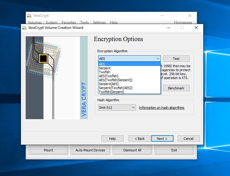 Dit is waar het leuk wordt. Hier kies je de versleuteling die je wilt toepassen. Standaard staat AES aangevinkt (Advanced Encryption Standard), die op zichzelf al nagenoeg onkraakbaar is. Je kunt hier nog combinaties maken met andere standaarden, maar AES zelf is veilig genoeg. Daaronder staat nog wel algoritme je kunt gebruiken, zoals SHA-512 of SHA-256 - die laatste is ietsje sneller, maar 512 is veiliger. Je hebt hier nog wat opties om te testen op kleinere bestanden, wat voor gevorderde gebruikers interessant is.
