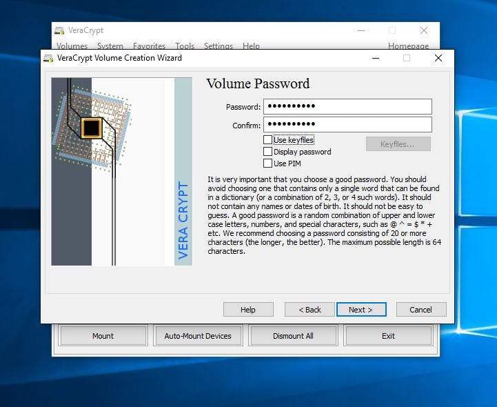 Hierna kies je je wachtwoord. We hoeven je hier waarschijnlijk niet te vertellen hoe je een sterke maakt - gebruik hier wel minimaal 20 tekens, want een kort wachtwoord is nog steeds makkelijk te kraken. Let ook op dat je hier keyfiles kunt gebruiken om wachtwoorden in te laden - mits je zorgt dat je ook die veilig én versleuteld bewaart.
