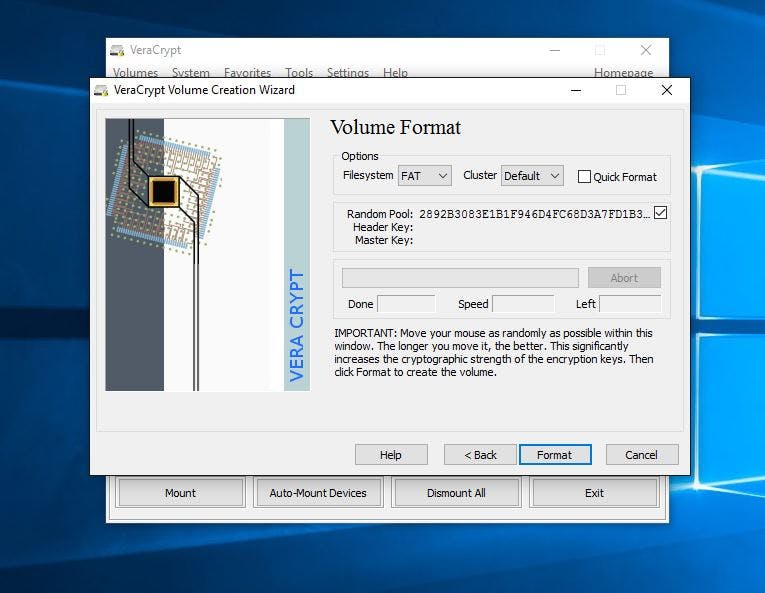 Dit is waar je de sterkte van je hash-pool opgeeft. Als je hier met je muis door het scherm beweegt, wordt de string met letters en cijfers als sleutel langer - en dus moeilijker te kraken. Hoe langer je je muis hier in het rond beweegt, hoe willekeuriger en langer de sleutel wordt. Bovenaan heb je nog de optie om je harde schijf te formatteren, en of je dat naar FAT(32) of NTFS wil doen. Als je hieronder op 'Format' klikt, krijg je nog de waarschuwing of je zeker weet dat je wilt ontsleutelen. Daarna wordt je versleutelde schijf gemaakt.