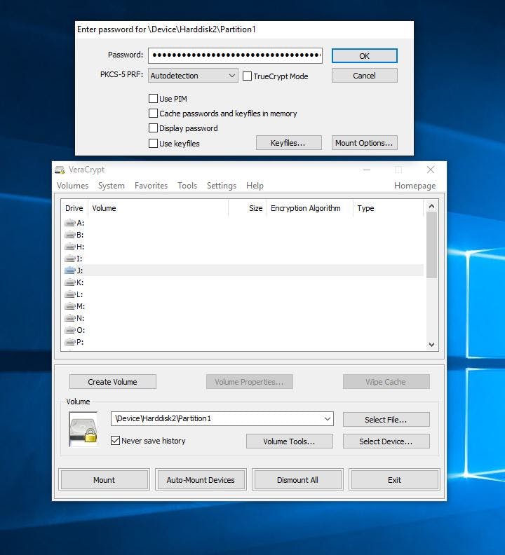 Als je een versleutelde schijf hebt, moet je die natuurlijk ook kunnen gebruiken. Je doet dat weer in het beginscherm van VeraCrypt, waar je een virtuele schijft kiest waarop je de schijf of container wil openen. Rechts zie je 'Select file' en 'Select device' staan, waarmee je je container kunt kiezen die je eerder had gemaakt, of de schijf die je wil ontsleutelen. Selecteer die, en klik onderin op 'Mount'. Je moet hier je wachtwoord invoeren. Als je schijf is ontsleuteld, kun je die gewoon openen als standaard-schijf in de Verkenner.