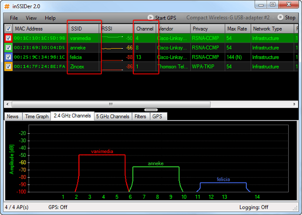Draadloze netwerken maken gebruik van een kanaal. Als uw buurman hetzelfde kanaal gebruikt, kunnen er vreemde storingen optreden of een slechte verbinding hebben. inSSIDer toont precies hoeveel draadloze netwerken er bij u in de buurt uitzenden en welk kanaal hierbij wordt gebruikt. De signaalsterkte van de draadloze netwerken laat inSSIDer zien in een grafiek. Voor een optimale verbinding mag uw draadloze netwerk niet (of weinig) overlappen met andere netwerken. U vindt de naam van uw netwerk in de kolom SSID en het kanaal in de kolom Channel. Het kanaal van uw draadloze netwerk kunt u aanpassen in uw modem/router. Raadpleeg hiervoor de handleiding van het kastje. Voer de aanpassing bij voorkeur uit met een netwerkkabel in plaats van een draadloze verbinding.
