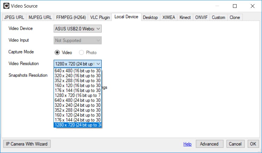 Zodra je iSpy voor de eerste keer opent, verschijnt er een Engelstalig introductievenster. Lees de informatie door en klik het met OK weg. Je gaat nu eerst een camera aan het programma toevoegen. In het geval van een webcam navigeer je naar Add / Local Camera. Achter Video Device staat de naam van de webcam vermeld. Kies bij Video Resolution de gewenste resolutie. Hoe hoger deze waarde, hoe duidelijker de videobeelden. Houd er wel rekening mee dat scherpe beelden meer opslagcapaciteit vergen. Dat is van belang wanneer je verderop in dit artikel de bewakingsbeelden gaat opnemen. Zorg bij een hoge resolutie dus voor voldoende opslagcapaciteit op de pc. Klik tot slot op OK.