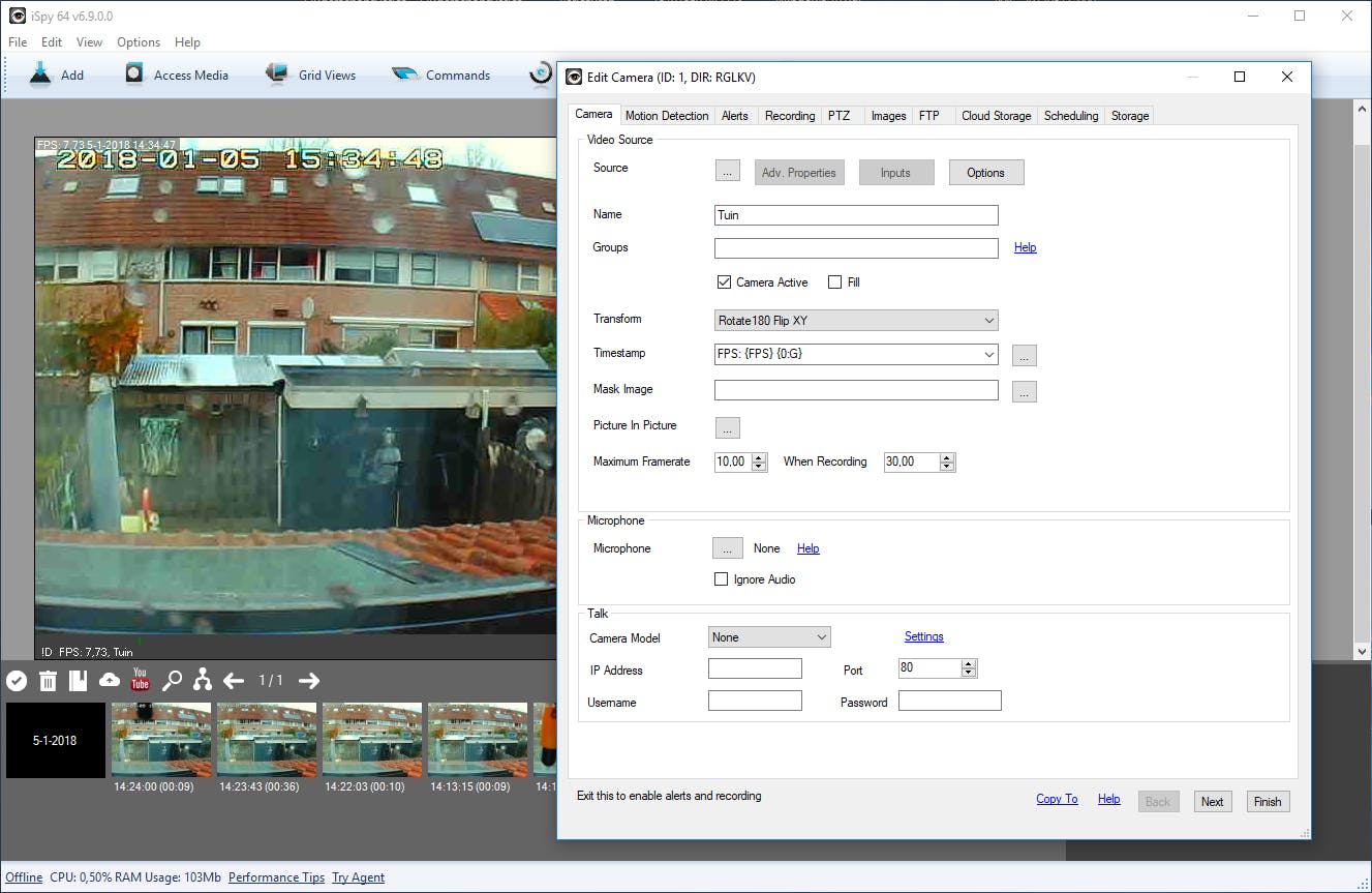 Nadat je een webcam of ip-camera hebt toegevoegd, verschijnt er direct een instellingenvenster in beeld. Die moet je volledig doorlopen om het bewakingssysteem correct te configureren. Is dit instellingenvenster onzichtbaar, maar heb je wel beeld? Klik dan met de rechtermuisknop op het videokader en kies voor Edit. Zeker wanneer je meerdere camera’s aan iSpy toevoegt, is het handig om ieder apparaat een eigen naam te geven. Vul bij Name dan ook een logische naam in, bijvoorbeeld tuin of garage. Vaak is het noodzakelijk om het camerabeeld te roteren, bijvoorbeeld wanneer het apparaat aan een muur- of plafondbeugel is bevestigd. Kies in het uitrolmenu achter Transform bijvoorbeeld voor Rotate 180 Flip wanneer je het beeld 180 graden wilt draaien. Tot slot is het verstandig om de verversingssnelheid tijdens opnamen te verhogen. Vul achter When Recording bijvoorbeeld een waarde in van 30.00 om vloeiende videobeelden vast te leggen. Klik op Next.