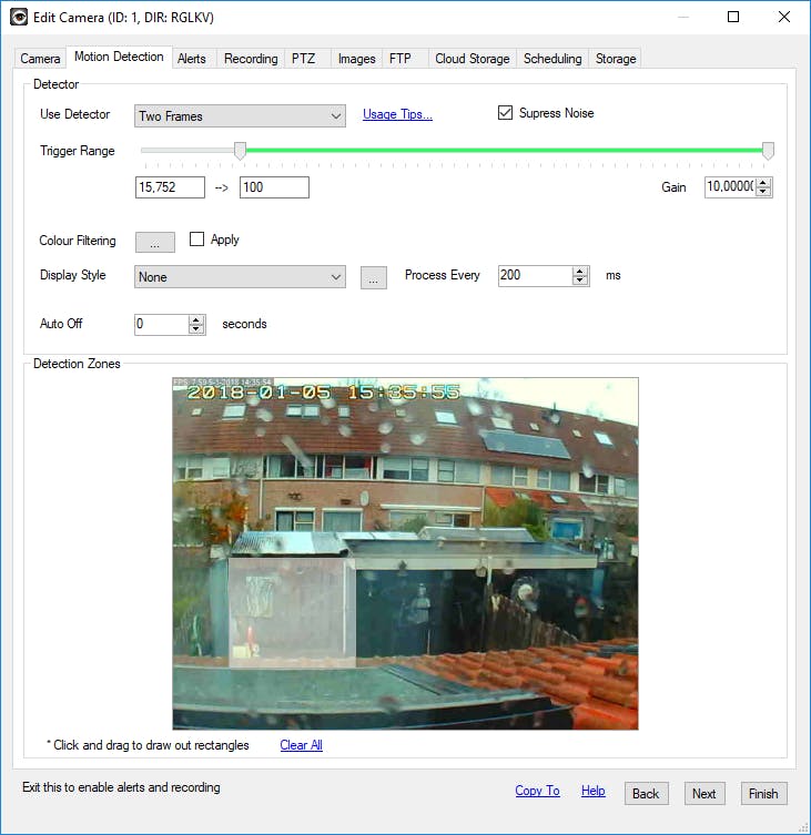 Je komt nu op het tabblad om bewegingsdetectie te configureren. Deze functie is standaard al actief. Zodra iSpy namelijk beweging constateert, kleurt de rand van het videokader rood en is er rechtsboven een opname-pictogram te zien. Je stelt naar eigen wens nog wat zaken in. De freeware ondersteunt verschillende detectieopties. Laat je deze instelling op Two Frames staan, dan vergelijkt iSpy continu de laatste twee frames met elkaar. Zodra het programma afwijkingen constateert, start de opname direct. Deze detectieoptie werkt prima, dus je hoeft hier niets te wijzigen. Via de schuifregelaar onder Trigger Range stel je de gevoeligheid van de bewegingsdetectie in. Begint de opname al wanneer er een blaadje uit een boom valt? Het is in dat geval beter om het linkerschuifje iets naar rechts te bewegen. Bij het onderdeel Detection Zones bekijk je een voorbeeldweergave van de camera. Eventueel laat je iSpy alleen op een specifiek deel van het videobeeld naar beweging speuren. Trek met de muis een rechthoek over het gedeelte dat je wilt controleren. Klik op Next.