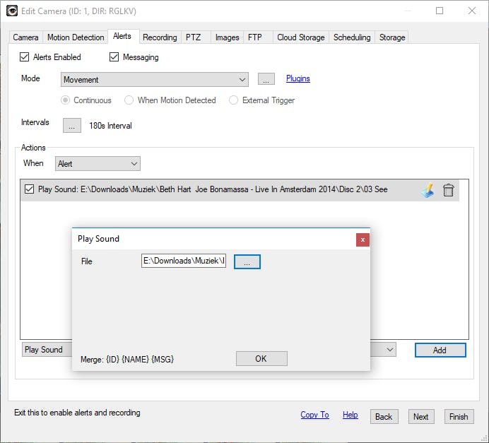 Zodra iSpy beweging constateert, kan het programma je eventueel alarmeren. Vink zo nodig bovenaan de opties Alerts Enabled en Messaging aan. Bij Mode zorg je dat de optie Movement is geselecteerd. Klik onderaan op Select Action. Zoals je ziet, zijn er diverse mogelijkheden om een alert te ontvangen. Kies voor Play Sound wanneer iSpy bij bewegingsdetectie een geluidsfragment op je computer moet afspelen. Je bevestigt deze keuze met Add en selecteert een wav-bestand op de harde schijf. Klik daarna op OK om dit alerttype te activeren. Je kunt er ook voor kiezen om bij beweging een specifiek bestand op te starten of een website te openen. Voor het ontvangen van een e-mail of sms-bericht is er een betaald iSpy Connect-account vereist, dus deze functies kun je niet zomaar activeren. Klik op Next.