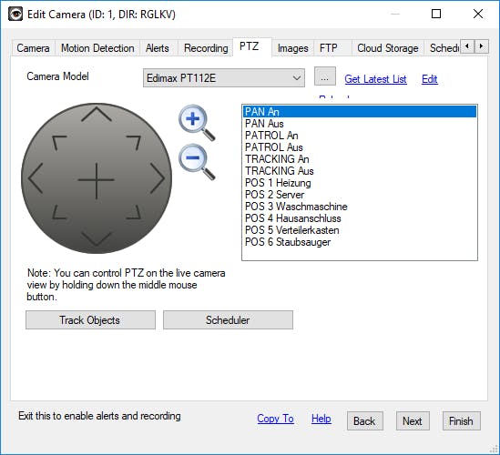 In de resterende tabbladen van het instellingenvenster pas je nog enkele opties aan. Bij gebruik van een zogeheten pan & tilt-camera is het tabblad PZT erg nuttig. Hiermee wijzig je de camerahoek op afstand door de pijltjestoetsen te gebruiken. Verder gebruik je de vergrootglazen om in en uit te zoomen. Ga naar het tabblad Scheduling wanneer je volgens een vast tijdschema wilt opnemen. Via Add selecteer je bij Action met Recording: Start en Recording: Stop de gewenste tijdstippen. Handig is dat je ook afzonderlijke opnamedagen in de week kunt opgeven. Tot slot navigeer je naar het tabblad Storage. Achter Media Location zie je in welke map iSpy de opnamen bewaart. De standaardmap is nogal ongelukkig gekozen, want die bevindt zich diep in het systeem. Klik op de knop met de drie puntjes en Add. Via de knop met de drie puntjes selecteer je een andere locatie. Bevestig je keuze met Map selecteren en klik tweemaal op OK. Achter Media Location selecteer je via het kleine pijltje vervolgens de nieuwe bestandslocatie. Sluit het instellingenvenster met Finish. Alle wijzigingen zijn nu opgeslagen. Voor het activeren van het tijdschema is naderhand nog een extra handeling vereist. Klik met de rechtermuisknop op het videokader en bevestig met Apply Schedule.