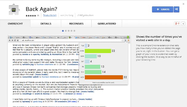 Back Again is een gratis extensie die je kunt downloaden in de Chrome Web Store. Eenmaal geïnstalleerd, houdt de extensie precies bij hoe vaak je een bepaalde website hebt bezocht. Is dat dan niet ontzettend privacygevoelig? Dat zou je denken, maar dat valt wel mee. Immers, diezelfde informatie wordt gewoon opgeslagen in de geschiedenis van Chrome, het enige verschil is dat Back Again er een overzichtelijk rapportje van maakt.