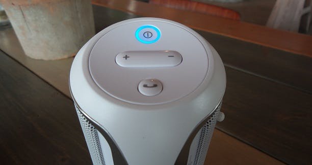 De gesprekken komen helder door en het volume is dermate op te krikken dat je er een flinke vergaderruimte mee kunt vullen. Opvallend en in het oog springend is de bovenkant van deze draadloze speaker; daar vind je knoppen voor het opnemen van een telefoongesprek, het skippen tussen nummers, de input selectiekeuze (Bluetooth, aux of microSD-kaart), een pauze- en startknop en de volumeregeling.