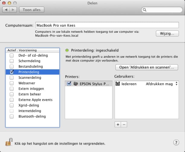 Een printer aan een Mac kan moeiteloos door andere Macs gebruikt worden, door eenmalig printerdeling in te schakelen op de Mac waaraan de printer met een usb-poort is verbonden. Daarna is de printer draadloos in het thuisnetwerk bereikbaar. Voorwaarde is wel dat de Mac met de printer aanstaat op het moment dat u wilt printen, omdat het systeem nu als printserver dienstdoet. Ook Windows-pc's kunnen erop printen, met hulp van een programma dat Apple gratis beschikbaar stelt. Het inschakelen van printerdeling op de Mac gaat via Systeemvoorkeuren (te bereiken via het Dock of het Apple-pictogram in de menubalk). Kies in het onderdeel Internet en draadloos voor Delen en zet een vinkje bij de optie Printerdeling. In het lijstje Printers: ernaast zal de printer vermeld staan. Zet ook daar een vinkje. Hebt u meerdere printers, dan bepaalt u zelf welke u beschikbaar stelt in het thuisnetwerk. Bij Gebruikers: kunt u de beschikbaarheid beperken tot bepaalde gebruikers, maar wij gaan ervan uit dat iedereen erbij mag.