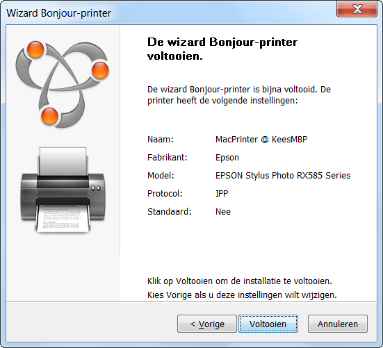 Start het programma op (er is een pictogram Wizard Bonjour-printer op het bureaublad geplaatst). Als het goed is, zal de printer die aan de Mac hangt al meteen in het lijstje getoond worden. Kijk of de printer geselecteerd is en klik dan op Volgende / Voltooien. Een printer doet normaliter weinig zonder stuurprogramma's. Het mooie is dat die nu automatisch voor u worden opgehaald en geïnstalleerd. U hoeft er dus verder niets aan te doen, alles gaat vanzelf. Controleer zodra het programma klaar is meteen even of het daadwerkelijk gelukt is. Ga op de pc naar Start / Apparaten en printers (in Windows 7). Als alles goed is gegaan, zal de printer hier nu keurig vermeld staan. Als laatste controle is het een idee om de Mac en de printer even aan te zetten, zodat u via de pc meteen een testprintje kunt maken. Dat kan door via Start / Apparaten en printers met rechts op de printer te klikken en te kiezen voor Eigenschappen van printer / Testpagina afdrukken.