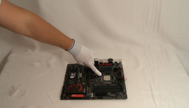 Voordat je het moederbord in de systeemkast schroeft, is het gemakkelijker eerst het geheugen, de processor en de koeler te plaatsen. Haal het hendeltje naast de socket naar boven en open indien aanwezig het klepje (bij Intel is er een klepje, bij AMD niet). Verwijder bij Intel het aanwezige beschermkapje, bij AMD is er geen beschermkapje. Wees vervolgens zeer voorzichtig bij het plaatsen van de processor. Klap bij Intel het dekseltje weer over de processor en druk bij zowel Intel als AMD de hendel vast.
