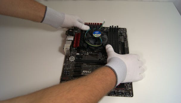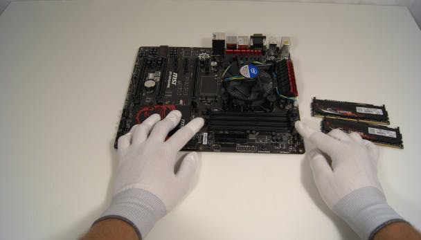 Gebruik je de meegeleverde koeling, dan zit er al vooraf een beetje koelpasta op de koeling in de vorm van een thermische pad. Let er wel op dat er vaak een sticker over de thermische pad zit ter bescherming, deze moet je eerst verwijderen. Gebruik je een losse koeling, breng dan de koelpasta aan op de processor en verdeel deze gelijkmatig over het oppervlak om te voorkomen dat er luchtbellen ontstaan. Gebruik niet te veel koelpasta, ongeveer een rijstkorrel is genoeg. Breng de koeling aan door kruislinks de aansluitpunten vast te drukken of te schroeven. Het geheugen wordt meestal per paar geplaatst. De sloten zijn in veel gevallen voorzien van verschillende kleuren, om duidelijk te maken hoe een set geplaatst kan worden. Zo niet, dan staat in de handleiding van het moederbord hoe je een paar moet plaatsen.