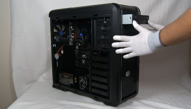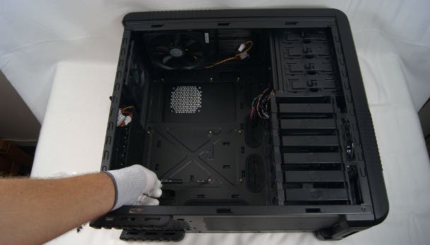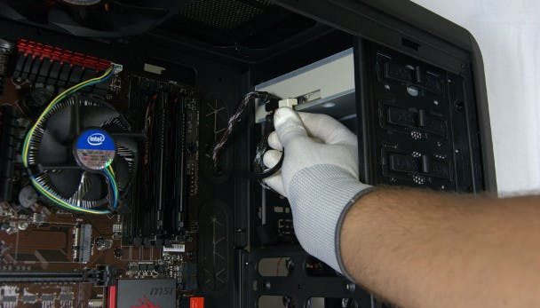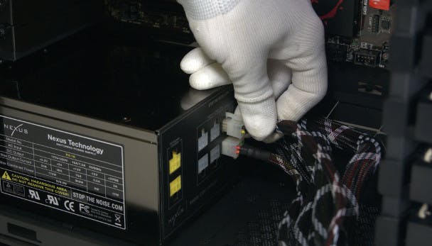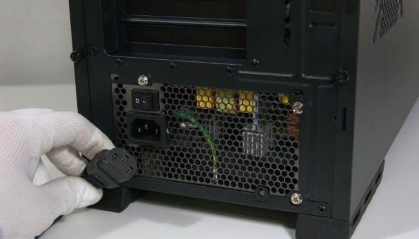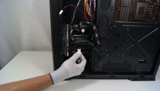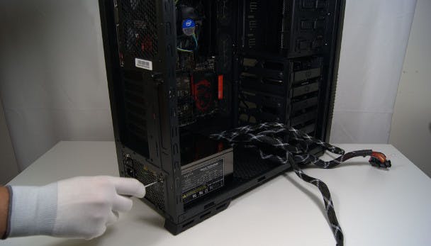 Als alles op zijn plek zit, kan de voeding worden geplaatst. Zet de voeding in het systeem en schuif deze tegen de achterkant van de behuizing. Schroef vervolgens de voeding aan de achterzijde van de kast vast met de meegeleverde schroeven. Als je een modulaire voeding hebt, kunnen ook de stekkers alvast worden aangesloten. Bepaal zelf hoeveel SATA-, molex- en 6pins- of 8pins-voedingsconnectoren voor de grafische kaart je nodig hebt. Weet je niet zeker hoeveel stroomaansluitingen er nodig zijn, dan kun je ook eerst de harde schijf, SSD en het optisch station inbouwen.