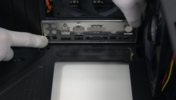 Als de afstandsbusjes zijn vastgeschroefd, vergeet dan niet het i/o-schild te plaatsen. Dit is het met je moederbord meegeleverde metalen plaatje met uitsparingen voor de aansluitingen. Je klikt het in een vierkante uitsparing aan de achterkant van de behuizing. Houd het moederbord iets gekanteld tegen het i/o-schild en leg het zorgvuldig op de afstandsbusjes. Controleer aan de buitenzijde van het i/o-schild of alles netjes op zijn plek zit en schroef het moederbord vast op de afstandsbusjes.