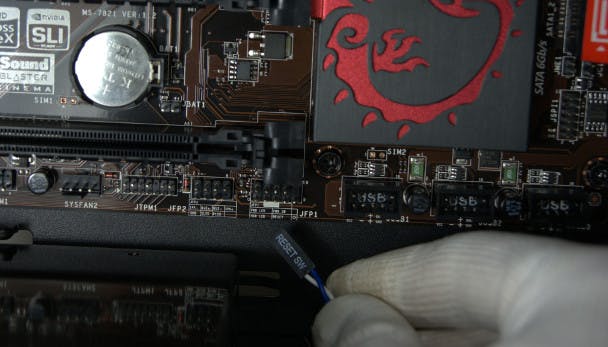 De pinnen voor deze stekkertjes zitten doorgaans bij elkaar op het moederbord. Soms wordt bij het moederbord een blokje meegeleverd waar je de draadjes op kunt aansluiten en het blokje vervolgens in één keer op het moederbord aansluit. Handig om te weten is dat op de connectoren vaak een driehoekje staat, dit driehoekje is de positieve-aansluiting (of plus). De witte of zwarte kabel is de negatieve aansluiting. Afhankelijk van het soort behuizing kunnen er nog andere aansluitingen zitten, bijvoorbeeld aansluitingen voor het voorpaneel zoals usb-, audio of SATA-aansluitingen.