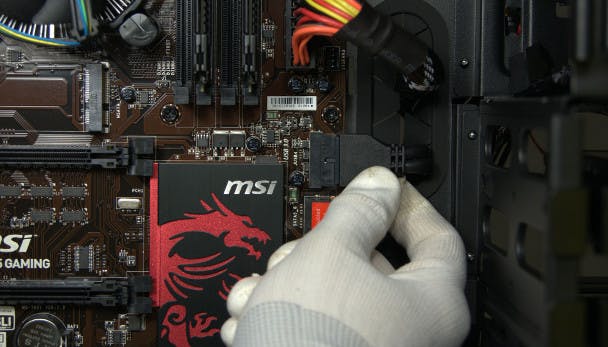 Bevestig de harde schijf, SSD en het optische station in de behuizing. Breng vervolgens een stroomkabel naar de stations en sluit deze aan. Sluit de SATA-kabels aan op het moederbord, breng deze naar de stations en sluit ze aan. Let wel op de volgorde: de schijf waarop je het besturingssysteem wil installeren komt op de eerste SATA-poort (poort 0 of 1), het optische station kan het beste op de laatste SATA-poort worden aangesloten. Soms zit er aan de buitenkant van de behuizing ook een SATA-aansluiting. Als je deze gebruikt, vergeet dan niet achteraf in het BIOS aan te geven dat deze poort hot-swappable is.
