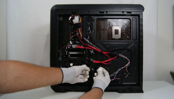 Zodra alles is aangesloten, kunnen de kabels netjes worden weggewerkt. Kabels wegwerken doen we om de luchtdoorvoer binnen de behuizing te bevorderen, zodat de componenten in de kast koeler blijven. De beste manier is de kabels netjes bij elkaar pakken en te voorzien van een tie-wrap of speciaal klittenband. Luxe behuizingen bieden vaak de optie kabels aan de andere kant (onder het moederbord) te laten lopen. Soms zitten er ook oogjes om de kabels aan vast te houden. Een 'ingewikkeld' klusje, maar met een beetje moeite lukt het wel. Als alle kabels op hun plek zitten, kan de kast worden dichtgemaakt en worden aangesloten.