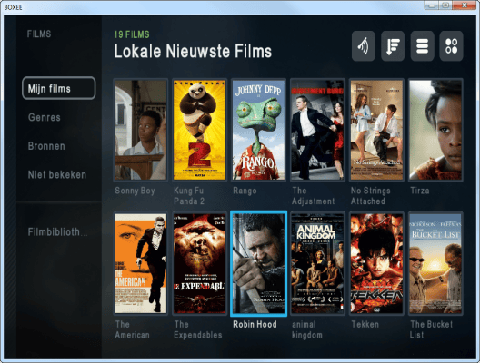 De interface van Boxee bevat grote pictogrammen.