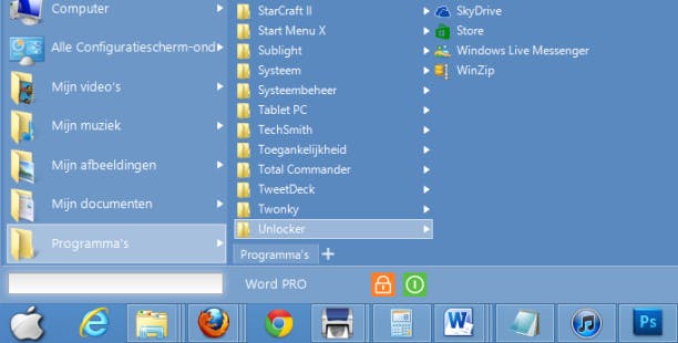 Zodra je het programma hebt geïnstalleerd en gestart, verschijnt er direct een knop Start linksonder in beeld. Wanneer je hierop klikt opent het menu Start, zoals gezegd in aangepaste vorm, waarmee je op oude vertrouwde wijze door je programma’s en bestanden kunt navigeren.