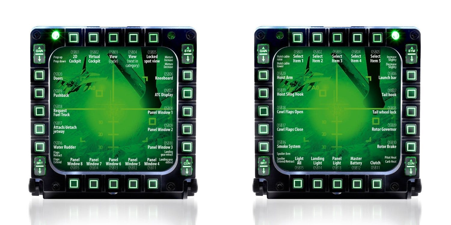 Met Arduino is een instrumentenpaneel met knoppen of regelaars niet heel lastig te maken. Maar ook het Thrustmaster MFD Cougar Pack (ongeveer 80 euro) is een mooie en betaalbare toevoeging. Dat is een set met twee panelen. Een paneel is een soort vierkant raampje met twintig knoppen en vier schakelaars, inclusief achtergrondverlichting.