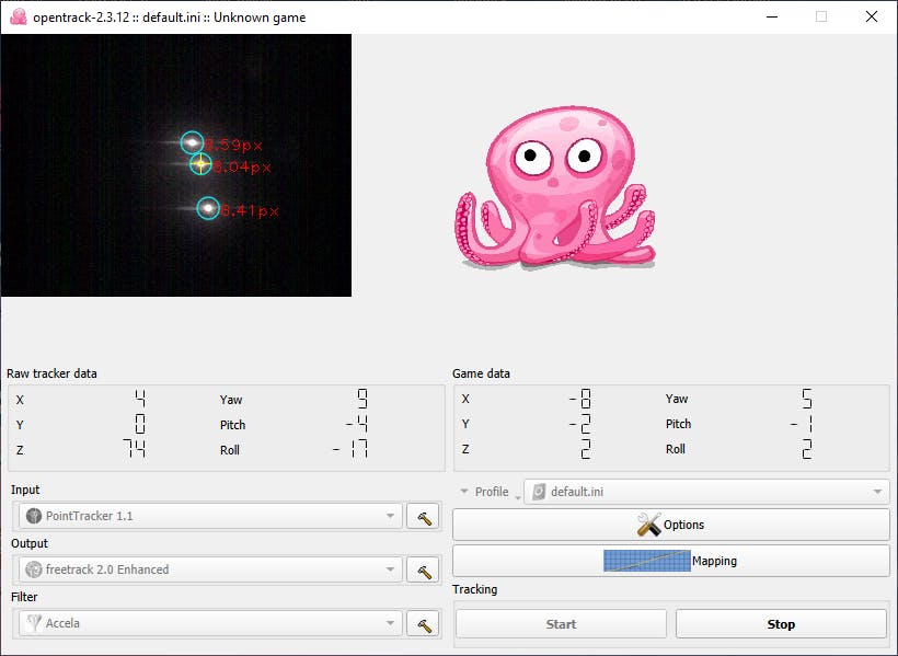 De aanbevolen software is het gratis OpenTrack. Je ziet direct of het werkt: de octopus beweegt dan met je mee. Gezichtsbewegingen worden bewust flink overdreven, zodat je je hoofd maar een klein stukje hoeft te draaien om helemaal naar links te kijken. Of je buigt iets schuin naar voren om een wijzerplaat af te lezen. Je kunt steeds je ogen op het scherm houden. Dit blijkt heel intuïtief en went erg snel. Soms is het wel nodig om – eventueel per sim – wat kleine aanpassingen voor bewegingen te maken, wat ook eenvoudig kan met OpenTrack.