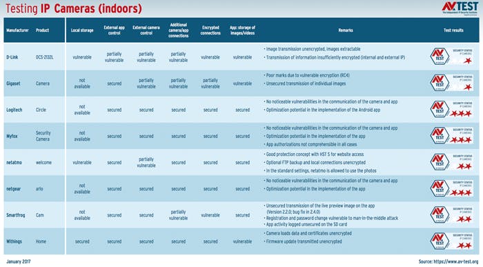 Camera's die door AV-Test als veiligst worden geacht, zijn de Circle van Logitech, de Arlo van Netgear en de 'Security Camera' van Myfox. Gekeken werd onder meer naar de verbinding tussen camera en verbonden apparaten (zoals app of FTP-server) en de versleuteling van de opslag. De security is op die gebieden bij deze modellen op orde.