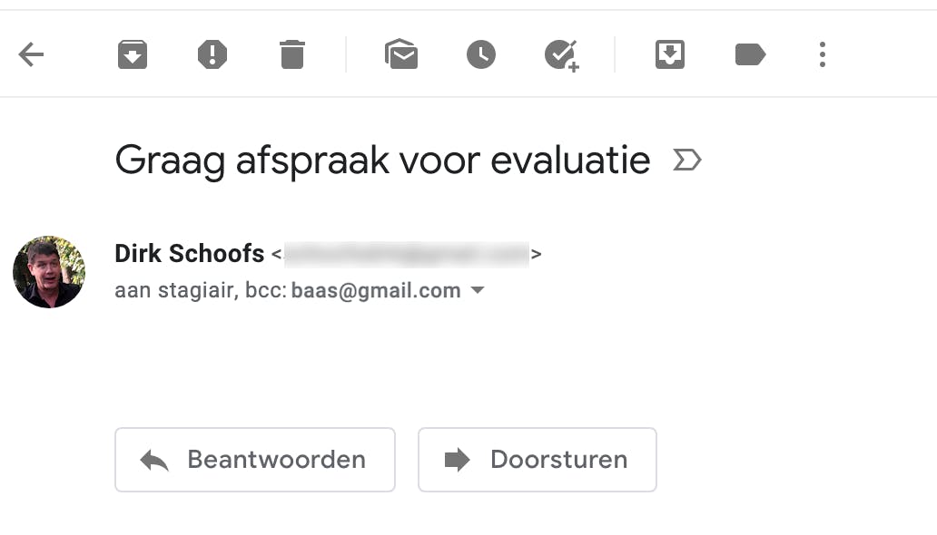 In het voorbeeld van hiervoor heeft de stagiair geen idee dat je baas (de tweede ontvanger) een BCC-kopie heeft ontvangen. Wanneer de stagiair jouw e-mail beantwoordt, ontvangt je baas zijn reactie niet, omdat het e-mailprogramma van de stagiair de mailadressen in het BCC-veld niet kan zien.