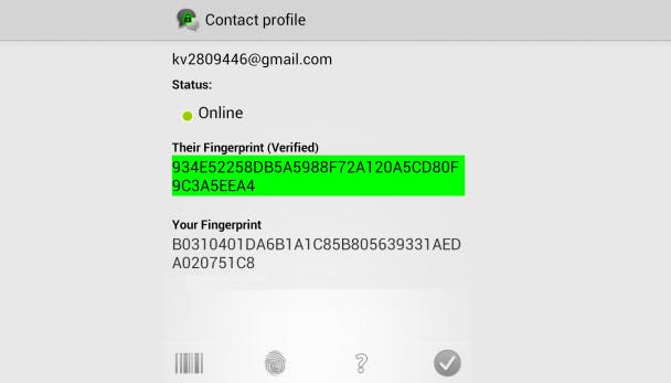 Google Talk (en diens opvolger Google Hangouts) zijn echter gebaseerd op XMPP, dus zolang jij en je gesprekspartner een Google-account hebben, kun je met ChatSecure op een veilige manier chatten. De eerste keer dat je de app opstart, kiest je je Google-account. Daarna verschijnen je contactpersonen in je vriendenlijst. Je kunt beginnen met chatten, maar zult een melding zien dat de identiteit van je gesprekspartner niet geverifieerd is. Druk daarvoor op de menuknop en dan op Verify. Ga na of de getoonde vingerafdruk juist is en bevestig.
