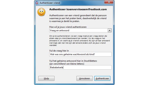 De status onderaan is nu echter veranderd van Niet privé naar Onbekend. Dat betekent dat je nog niet zeker weet of je contactpersoon wel is wie hij beweert te zijn. Pidgin geeft dan ook de melding dat je je contactpersoon maar beter kunt authentiseren. Klik daarvoor rechtsonder in het gespreksvenster op Onbekend en kies dan Authentiseer vriend. Dat authentiseren kan op drie manieren. Als je Vraag en antwoord kiest, dan vul je een vraag in die enkel je contactpersoon kan beantwoorden en geeft het antwoord in, waarna Pidgin die vraag stelt en je contactpersoon enkel toelaat als het antwoord overeenkomt.