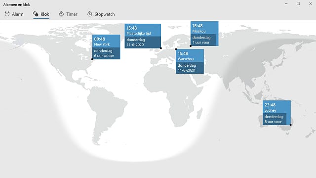 Precies dat kan met de app Alarmen en klok, die standaard aanwezig is na een installatie van Windows 10. Start de app – te vinden in het startmenu – en klik daarin op Klok in de knoppenbalk. Je ziet nu een wereldkaart met daarop in ieder geval een stip (en de bijbehorende) tijd op de plek waar je nu bent. Om een andere locatie toe te voegen, klik je op de +. Vul vervolgens de plaatsnaam in die je zoekt en kies de juiste uit het geopende lijstje en je ziet dat er een tijdblokje wordt toegevoegd op de kaart.