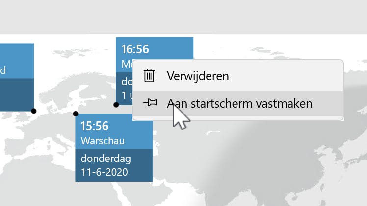 Om een tijdblokje te verwijderen, klik je er met de rechtermuisknop op en kies je vervolgens voor Verwijderen. Deze wereldklok biedt nog een aardige optie: je kunt locaties (en hun actuele tijd) ook als tegel aan het startmenu toevoegen. Klik daarvoor weer rechts op een blokje en vervolgens op Aan startscherm vastmaken. Bevestig met een klik op Ja. Je hebt er nu een tegeltje bij! Die tegel verwijderen kan op de gebruikelijke manier rechtstreeks via het startmenu. Alleen denkt de app dan dat ie er nog steeds in staat.