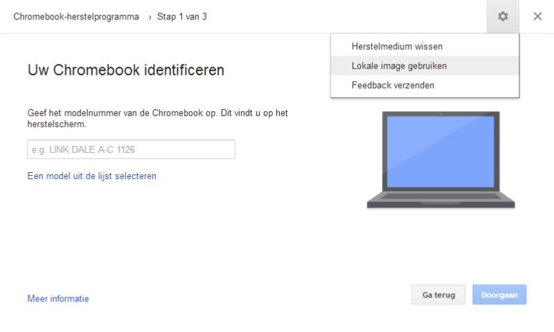 Klik in het herstelprogramma op het tandwiel rechtsboven en kies voor de optie Lokale image gebruiken. Blader nu naar het ZIP-bestand van CloudReady en klik op Openen. Op OS X is het trouwens even nodig The Unarchiver uit de Mac App Store te halen, daarmee de ZIP uit te pakken en vervolgens het *.bin-bestand dat eruit is gehaald in het Herstelprogramma te gebruiken. Selecteer nu de USB-stick die je wilt gebruiken om Chrome OS mee te installeren en klik op Doorgaan. Controleer nog even of alle instellingen kloppen en klik dan op Nu maken. De opstartschijf wordt nu aangemaakt. Zodra deze klaar is, kun je de wizard sluiten.