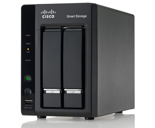 De Cisco NSS 322 is een strak vormgegeven NAS met twee schijven. De twee schijven zijn hot swappable, maar een slotje om de slede te vergrendelen ontbreekt. De voorzijde van de behuizing is behalve een aantal status-led's ook voorzien van een usb-poort. Achter op de NAS zitten nog vier usb-poorten en twee eSATA-poorten. De twee gigabit-netwerkpoorten kunnen gecombineerd worden tot één snelle poort, maar zijn ook als twee losse poorten of als failover (waarbij wanneer één netwerkverbinding defect zou raken, de ander het overneemt) bruikbaar. Tot slot is er een VGA-poort om in geval van systeemfalen een monitor op de NAS te kunnen aansluiten.