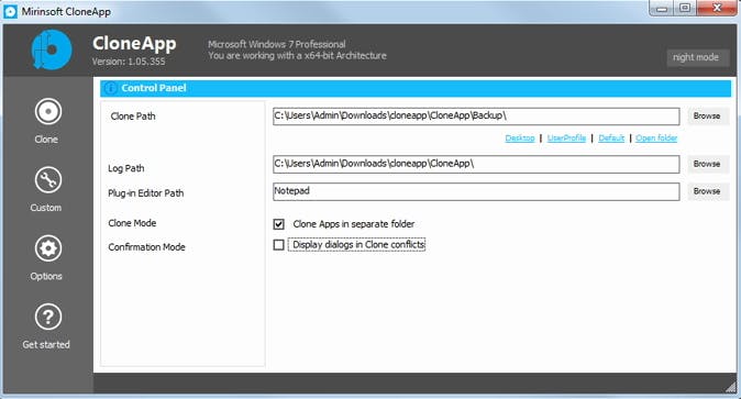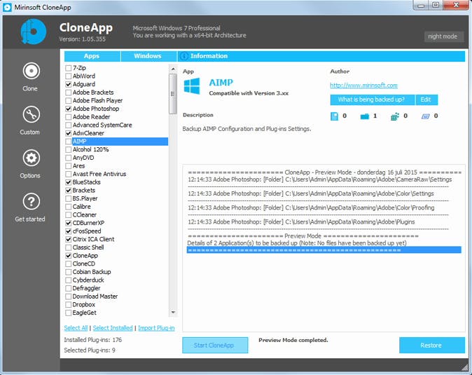 www.mirinsoft.com is portable en je hoeft het gedownloade zip-bestand alleen maar uit te pakken en het bijhorende exe-bestand als administrator op te starten. Wanneer je vervolgens Clone aanklikt en de kolom Apps opent, zie je meteen alle ondersteunde applicaties. Op moment van schrijven telden we er 176, maar er komen geregeld nieuwe bij. De werking kan nauwelijks eenvoudiger: je plaatst een vinkje bij alle (op je systeem geïnstalleerde) applicaties waarvan je de instellingen wilt back-uppen en je drukt op de knop Start CloneApp. De back-upbestanden belanden automatisch in een submap van de map van waarin je CloneApp hebt uitgepakt. Deze locatie kun je altijd nog aanpassen via de knop Options.