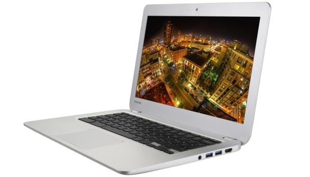 De erg ruime accu met een capaciteit van 52 Wh maakt een werktijd van zeven uur mogelijk. Qua uitbreidingspoorten hebben we met tweemaal usb 3.0, een HDMI-aansluiting en een kaartlezer niet te klagen. Dit 13,3inch-scherm heeft een resolutie van 1366 x 768 pixels. Een erg goed scherm is het niet: vooral de inkijkhoeken vallen tegen. Helaas is het scherm glanzend afgewerkt, waardoor het spiegelt. Je krijgt dus zeker geen heel indrukwekkende hardware, maar de combinatie van prijs, schermformaat, gewicht en vooral de accuduur (ongeveer 7 uur) maken heel veel goed. Toshiba heeft met de Chromebook 2 al een opvolger klaar staan, maar kon deze voor dit artikel nog niet aanleveren.